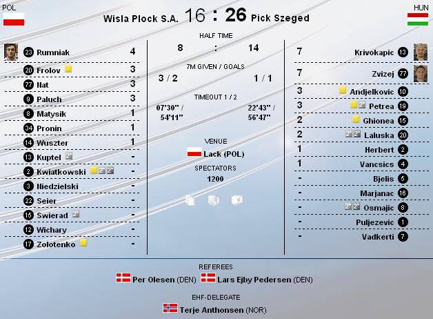 Bajnokok Ligja: Wisla Plock-Pick Szeged: 16-26 |